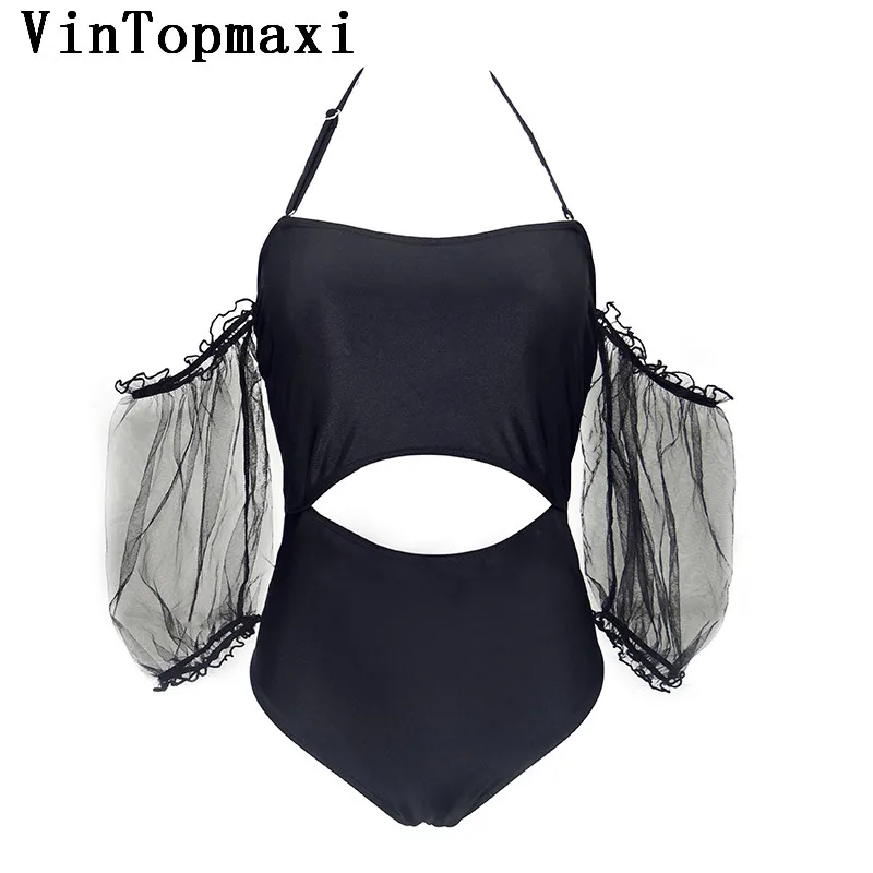 2018 New Sexy Off The Shoulder Mesh Puff sleeves Swimwear Women One